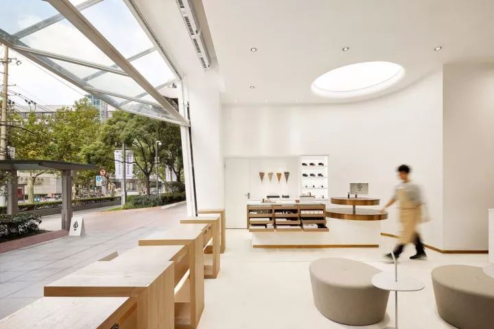 室内十分简洁,开放式的橱窗和巨大的玻璃墙,让整个空间特别明亮,视觉豁达。原木色与白色之间又适当应用浅灰色等淡雅的颜色进行融合,使得整个空间简约而多了一分层次设计感。功能区的设置划分也因此得以巧妙分解。