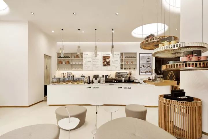 这家店以茶为核心,色调上以纯粹的白色和原木色为主,各式条纹木形贯穿其中,通有曲直之性和生机之源。