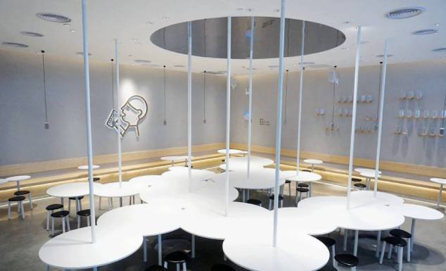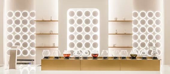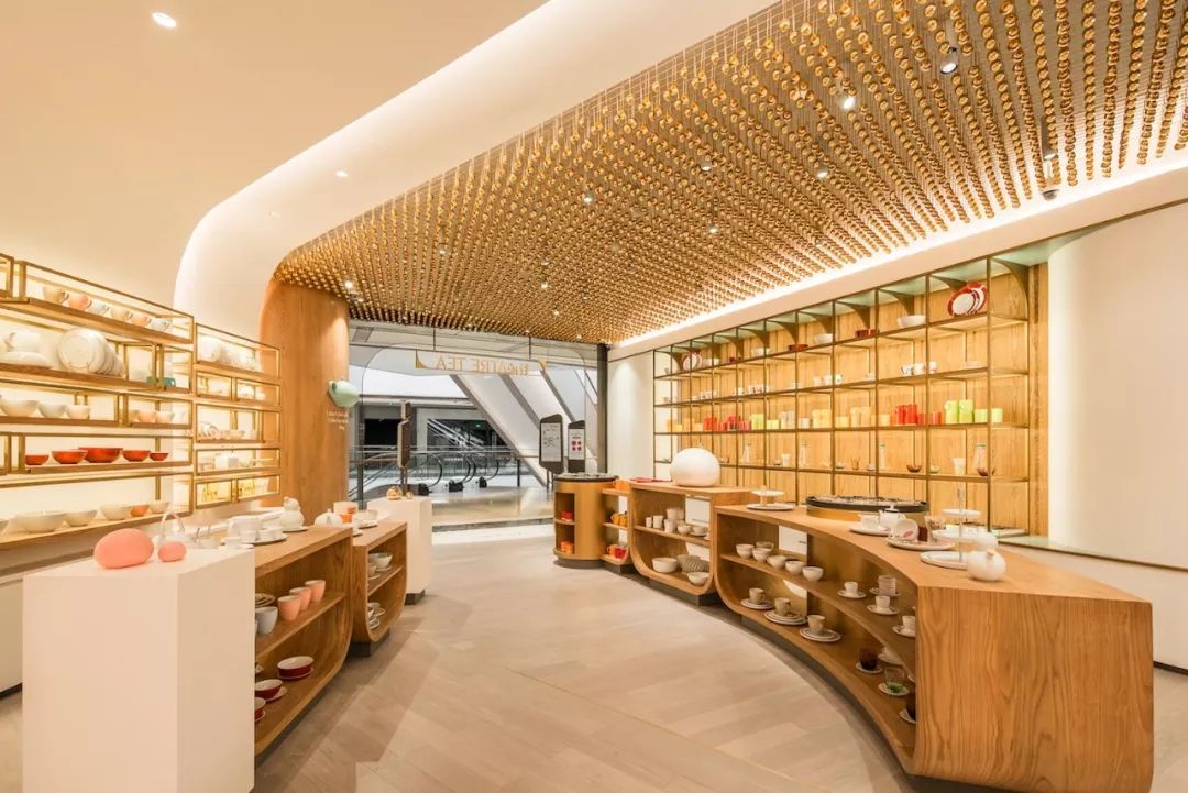 空间顶部用4000把的金属茶勺和1500余枚茶滤构成的叶形吊灯,将茶园景色映衬于空中,设计感十分强烈。