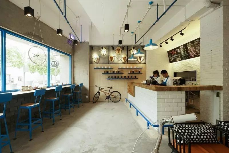 再配合上品牌的经典蓝色,咖啡厅的小清新气质也出来了。不仅复古时尚,又生机勃勃地饱含岁月的质感。