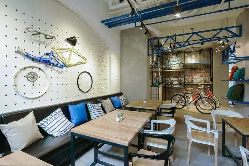 不久前它又开了一家新店,这家店是敞开式的空间,同样各式经典的自行车元素随处可见。虽然在设计上依旧将复古进行到底,但相对于第一家店明显进行了升级,更活泼时尚了。