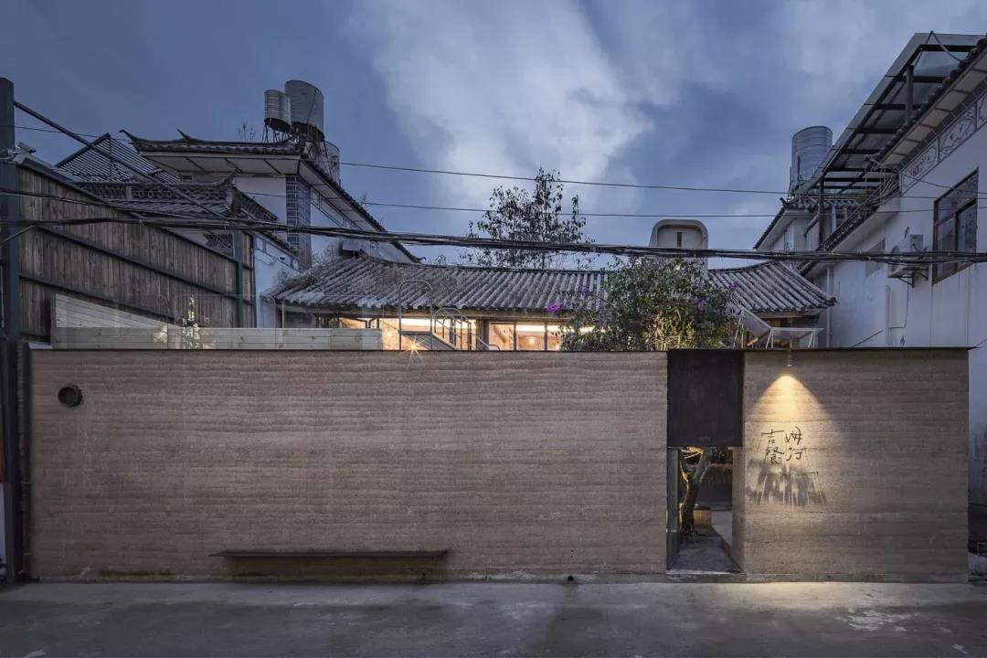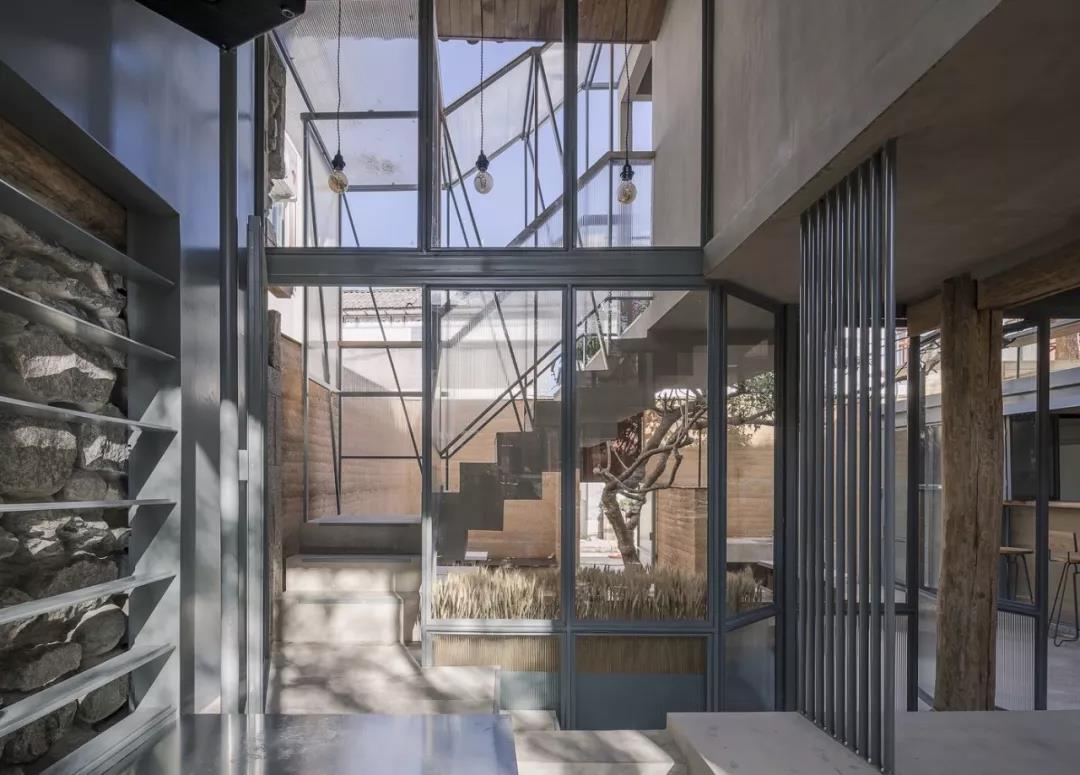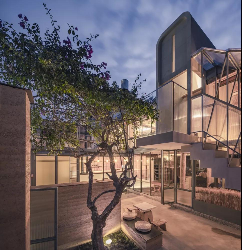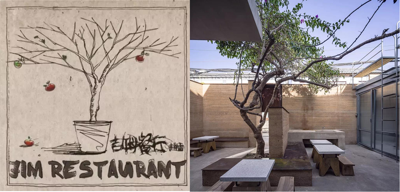在四周围起夯土墙面,维合着庭院将人们聚集到一起,低矮的入口只有低头才能进入,表达一种谦虚的态度。而餐厅内有一棵树,从平地破土而出。这和赵雷专辑的封面及音乐理念十分契合~