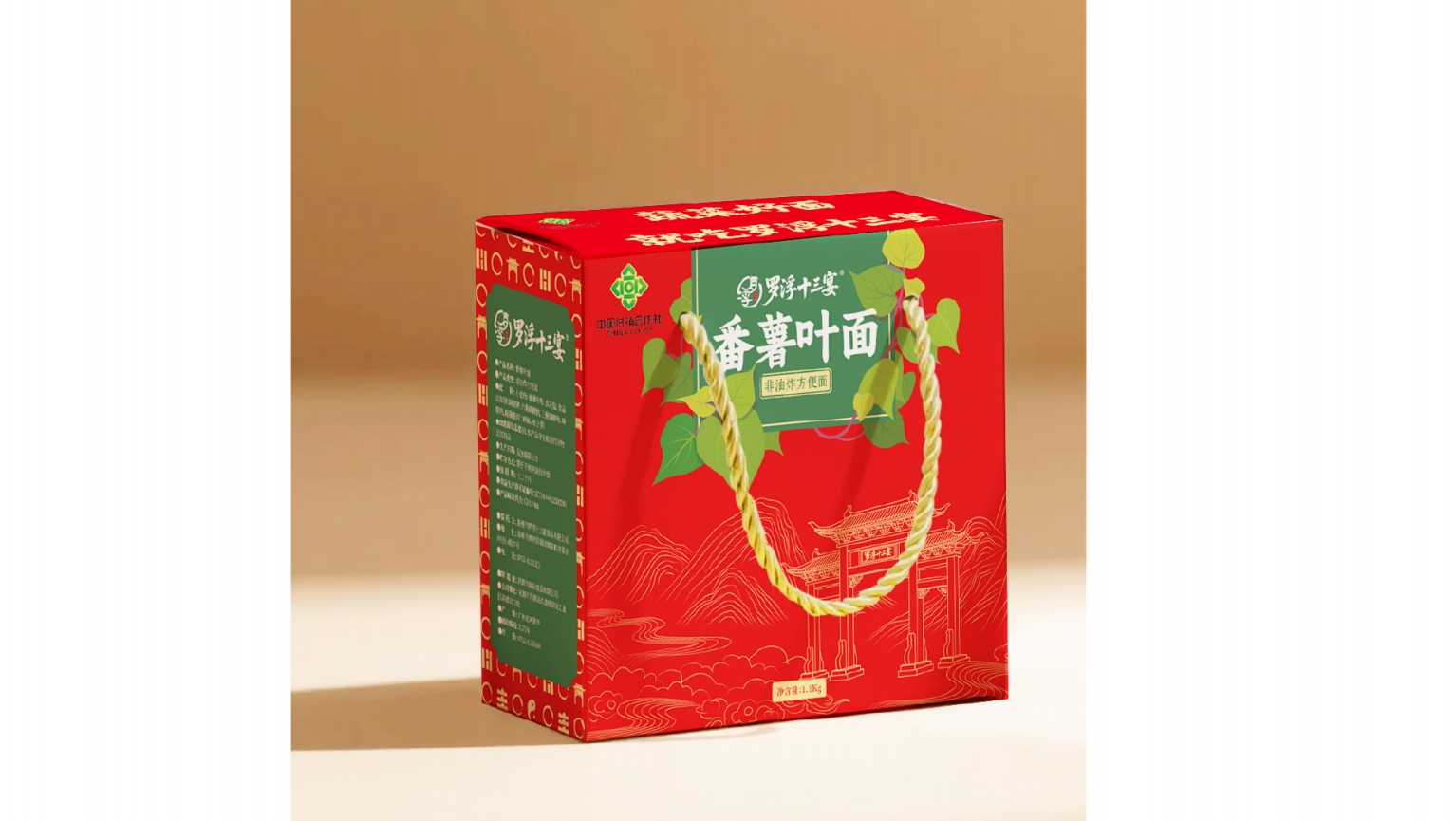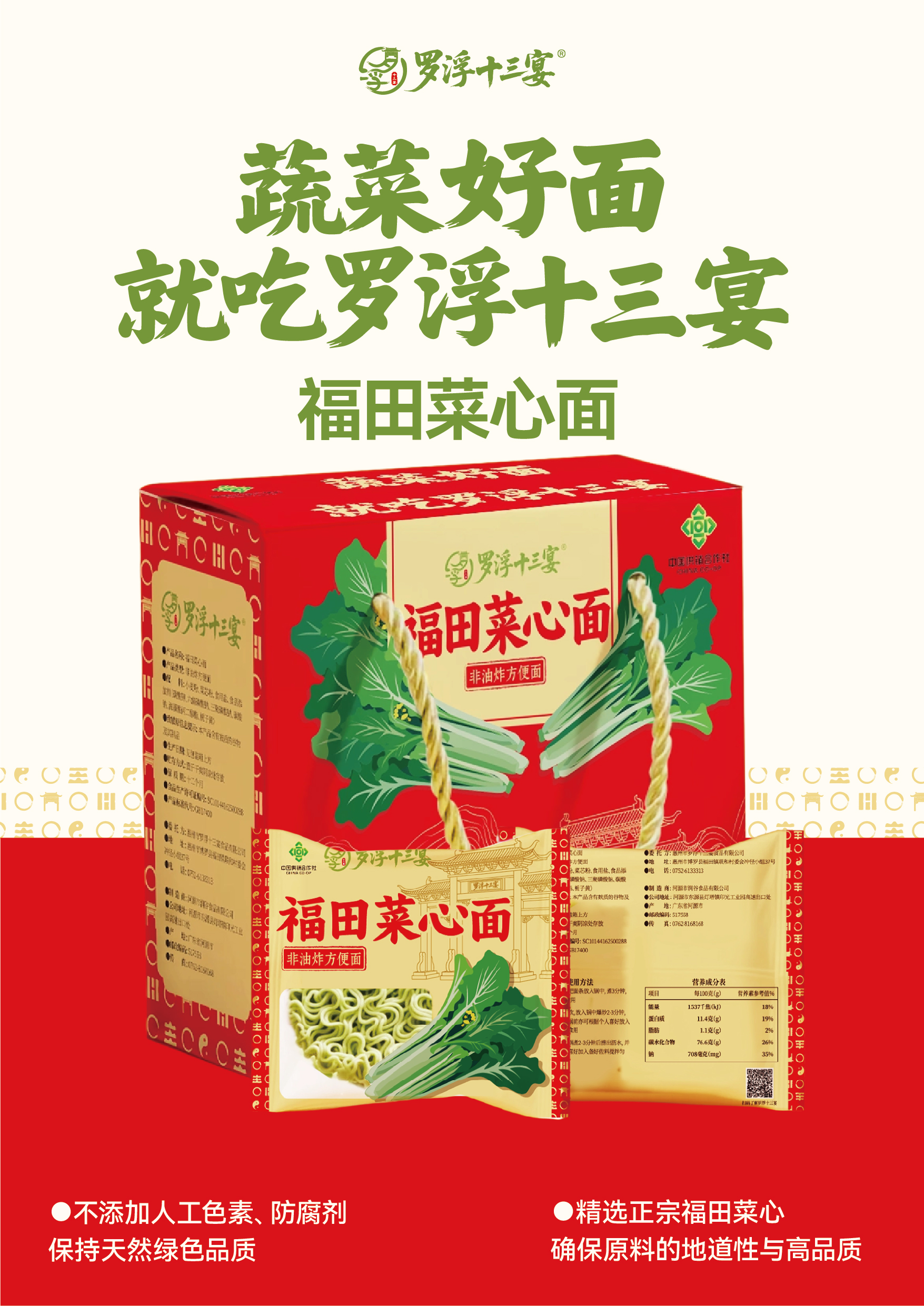 核心视觉符号:大面积菜心插画(绿色)与红色背景形成强烈对比,直观传递“蔬菜面”的产品特性,降低消费者认知成本;罗浮山门楼剪影强化地域文化符号,与“罗浮十三宴”品牌名形成呼应,增强文化信任感。